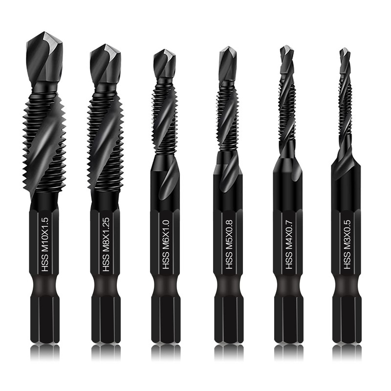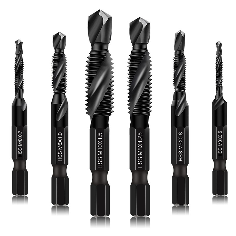1.Combination Drill & Taps Bit Set can be used to tap various threads to meet different needs - including 6 SAE sizes:M3*0.5,M4*0.7,M5*0.8,M6*1.0,M8*1.25,M10*1.5.