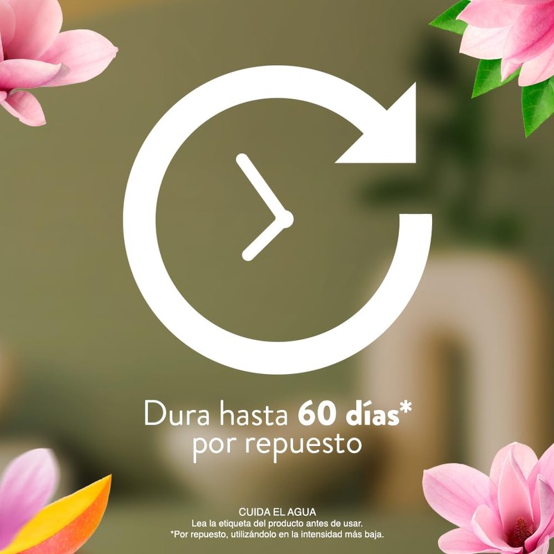 - Dura hasta 300 días (60 días por repuesto, usándolo en la intensidad más baja) -Fragancia enriquecida con aceites esenciales naturales -Aromatizante de ambiente continuo