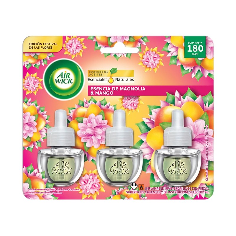 Airwick® Aromatizante de Ambiente Continuo, 3 repuestos, Esencia de Magnolia & Mango 20ml c/u.