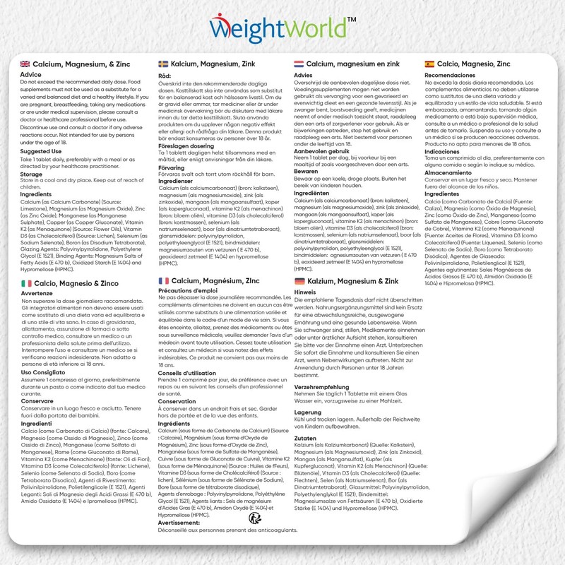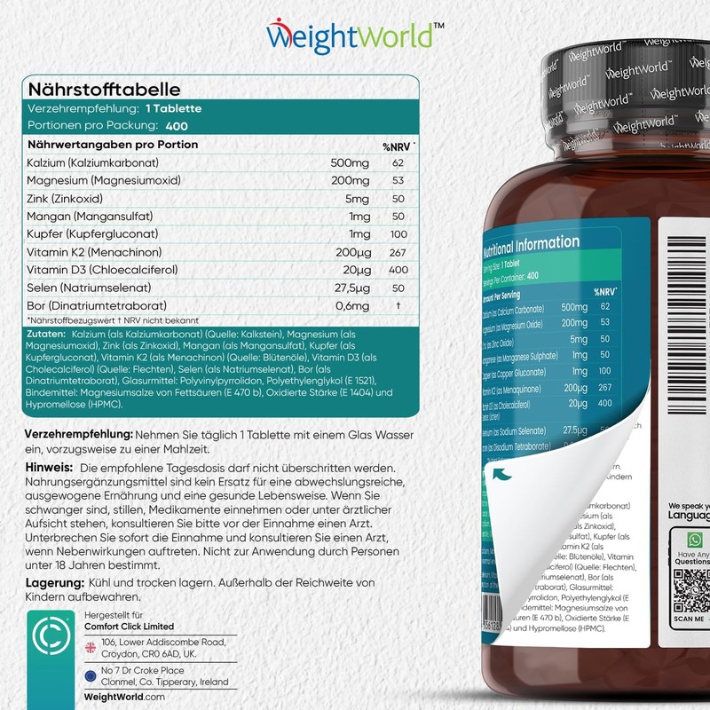 Calcium, Magnesium, Zinc - 400 Vegan Tablets with Vitamin D3, K2, Selenium, Manganese, Boron - Tested & Natural Vitamins & Minerals - 500 mg Calcium - Electrolyte Balance - WeightWorld