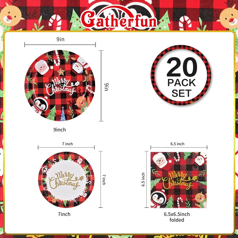 • SERVE 20: Christmas buffalo plaid tableware contains 20 * 9" disposable round paper plates with checkered pattern,snowman, santa claus and moose, 20 * 7" disposable round gingham paper plates, 20 * gingham napkins paper