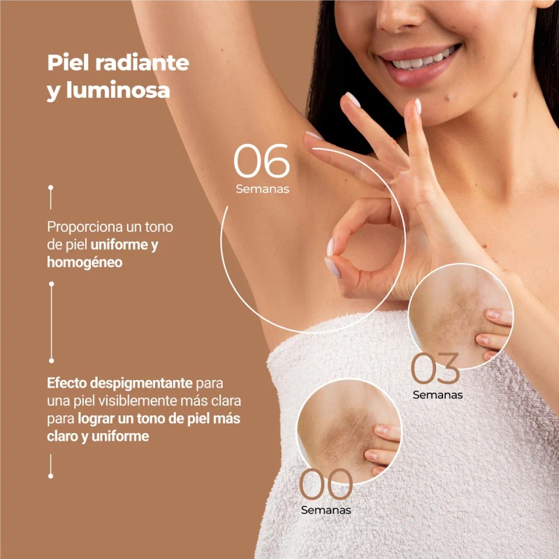 - BENEFICIOS: Ayuda a aclarar el tono de la piel y las manchas leves. Ayuda a prevenir el envejecimiento prematuro. Brinda luminosidad a la piel. Los componentes de la fórmula inhiben la tirosinasa, sustancia que contribuye al desarrollo de manchas en la piel.