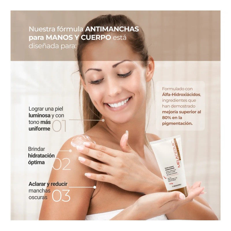 - Meladermic Manos y cuerpo es una crema blanqueadora y regeneradora de las células de la piel. Crema facial y corporal que te ayudara, a disminuir las zonas oscuras de las axilas e ingles, así como manchas y pecas en zonas extensas. Meladermic Despigmentante para manos y cuerpo. Tratamiento dermatológico para combatir la hipermegtación, manchas y paño en la piel. Venta en Línea. Tratamiento específico para las hiperpigmentaciones de las distintas áreas del cuerpo. Ingredientes naturales: como Alfa