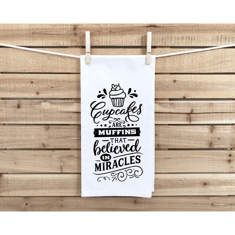 Cupcakes are Muffins That Believed in Miracles Flour Sack Dish Tea Towel Black and White Cute Cotton Kitchen Decor Housewarming Gift for Women Mom Baker Idea