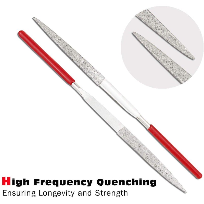 Kit includes:10 Diamond Needle File Set(10 Different Pattern)The following patterns: barrette, crossing, equaling, knife, warding, square, three square, half round, tapered round, and roundLength of the diamond file: 5.5"Diamond working length: 1.6"Diamond grit: 150Comfortable dip handles provide excellent grip when exposed to fluid or moisture1 Micro CutterMicro Soft Wire Cutter, Flush Cut, Nonslip hand grips provide comfort and control. Perfect to plastic model kits cutting and small objects, will match and complete the needle files.1 Carrying CaseUse it to storage files and cutters or another small tools you need to use in fine working. a small strap allows you to hang it on anything.Suitable for:- Jewelry making? - YES!- 3D prints or plastic models? - YES!- Mold lines, carving or multiple hobbies? - YES!- Miniatures, guitars, small object filing? -YES! Please note:For long-lasting use please use a lubricant, such as water, when using all diamond-coated tools.