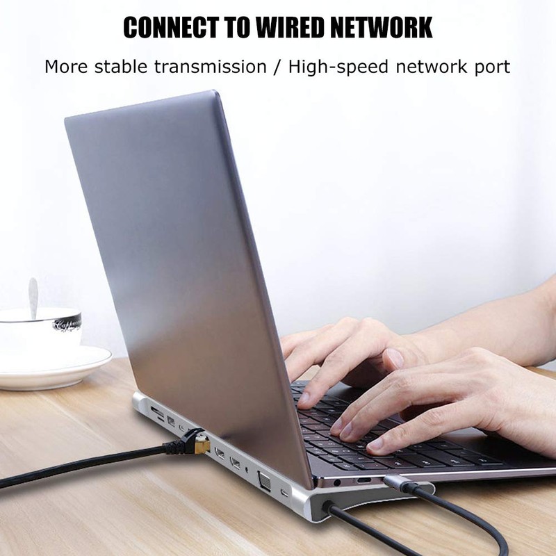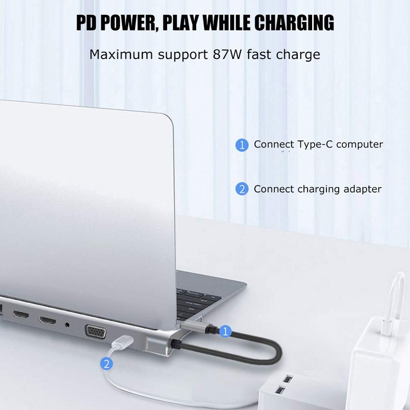 - Estación de Acoplamiento USB C 12 en 1: con esta estación de acoplamiento para laptop, puedes satisfacer fácilmente tu uso diario, incluye 1 HDMI 4K y 1 HDMI 2K, VGA, Ethernet RJ45, 2 puertos USB 3.0, 1 puerto USB 2.0, puerto de carga de alimentación USB C (máximo 87 W), un puerto USB C3.0, lector de tarjetas SD / Micro SD y micrófono / audio de 3.5 mm.