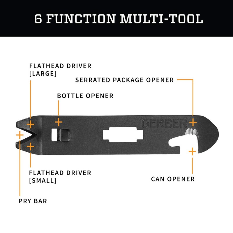 • 取り外し可能なツールは、鋸歯状パッケージオープナー、缶オープナー、栓抜き、こじ棒、小型マイナスドライバー、大型マイナスドライバーが特徴です。