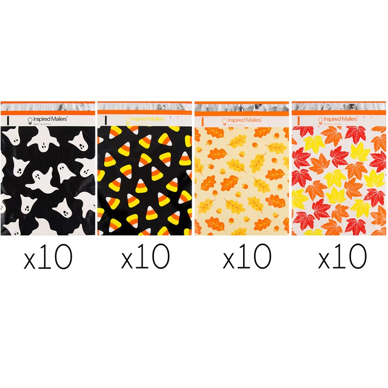 Inspired Mailers - Fall Poly Mailers 10x13 Variety Pack of 40-10 each: Candy Corn, Halloween Ghosts, Fall Foliage, Autumn Leaves - Package Envelopes (10x13, 40 Pack)