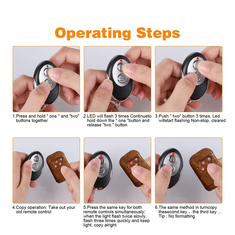 - 【To copy the remote control】:1) Delete the code you do not need: Press and hold the unlock/lock button at the same time, when the indicator light flashes three times, select any button and press it three times continuously (the other hand holds down the other button), then the indicator light will change to the state of flashing continuously, which means it has been deleted successfully