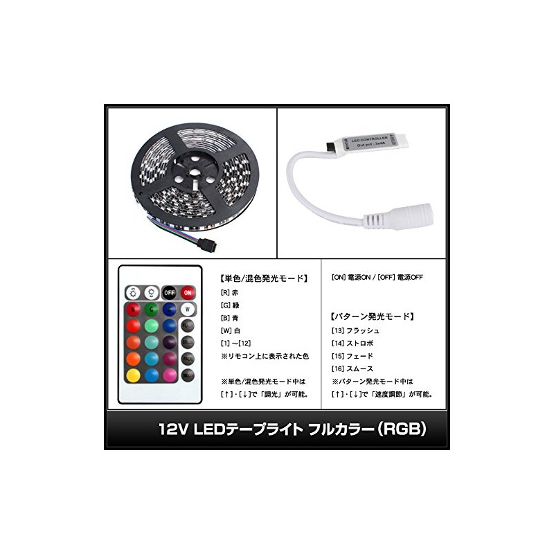 - Specifications: LED Specifications: 5050 3-chip LED/Input Voltage: DC 12 V / Board Color: Black Base / Emitting Color: RGB (Full Color) / Power Consumption: Approx. 30 W / Current Value: Approx. 2.5 A / LED Quantity: 300 Lights (3 LEDs in 5 cm increments) / Waterproof: Tape Light Body Only / Cut Line: Can be cut every 2 cm / Tape Length: Approx. 0.4 inch (10 mm) / Tape Approx. 2.5mm/Cable Length: Approx. 5cm