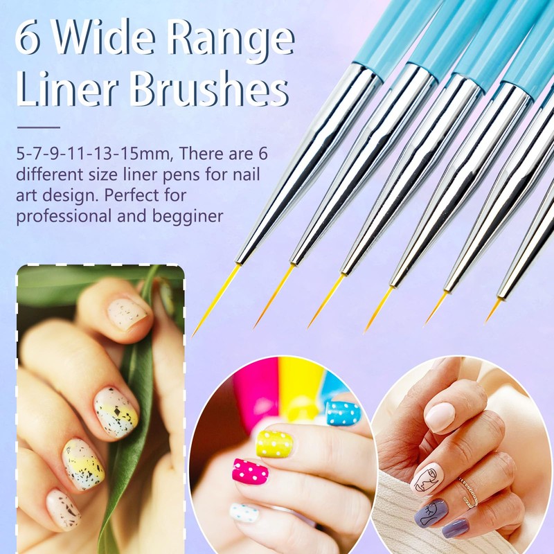 - ✨【6 STÜCK LINIENBÜRSTEN】6 durchscheinende blaue Nailart-Linienpinsel. Hier sind die Bürstenkopfgrößen: 5-7-9-11-13-15mm. Mit diesem Pinselset von 5mm bis 15mm können Sie die unterschiedlichsten Nageldesigns erstellen. Und es enthält extra lange Bürstenköpfe: 15mm. Sie können damit professionellere Designs und Muster erstellen.
