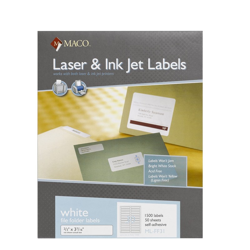 Maco ML-FF31 Assorted Laser & Inkjet File Folder Labels - 0.67" Width x 3.44" Length - 1500 / Box - 30/Sheet - Inkjet, Inkjet - White