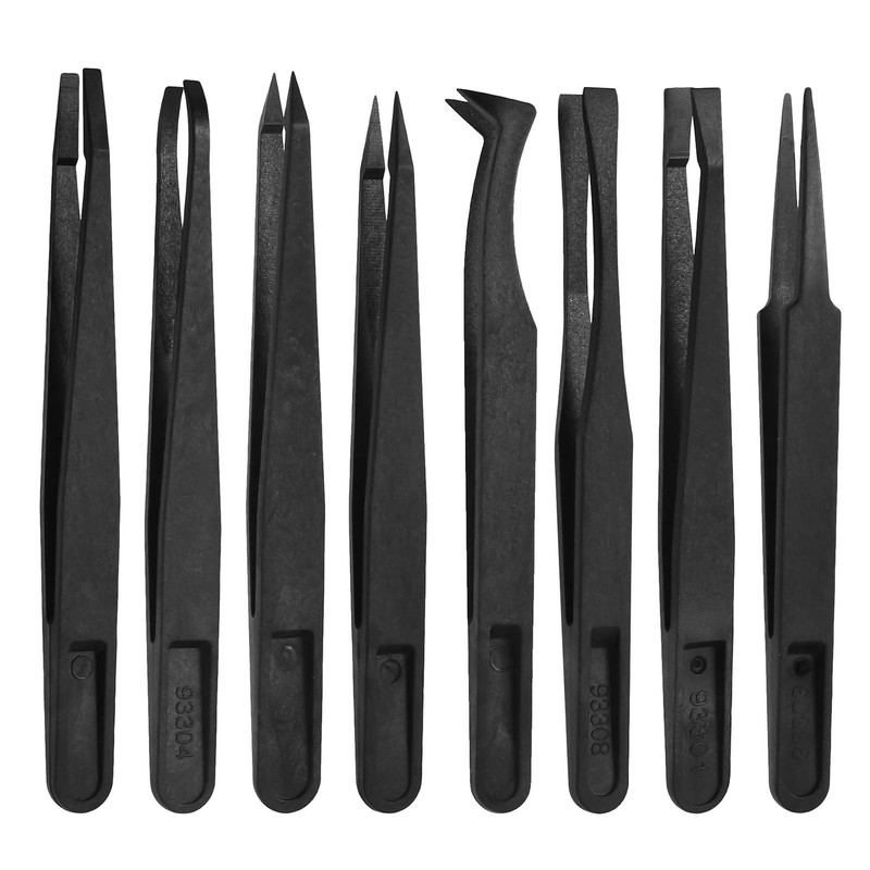 - PRODUCT HIGHLIGHTS - Made of plastic in black, beveled flat tip, antistatic. The tweezers for semiconductors, hard disk drive, electronics industry, etc