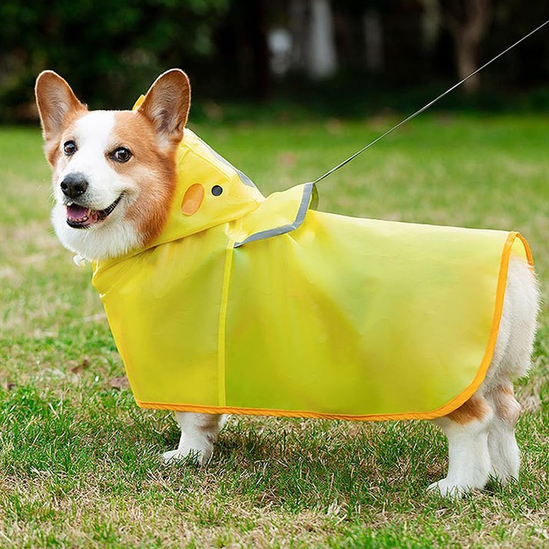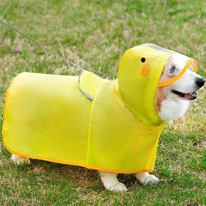 - Features: The raincoat has a transparent brim that ensures a wide field of vision, and the elastic on the head is adjustable, so you can match the size of your dog's head. There is also a reflective tape on the head, a hidden lead hole in the back, and the holes have a waterproof cover. 2 fixed rubber on the back leg to protect your dog all over. Durable adjustable plastic buckle on belly