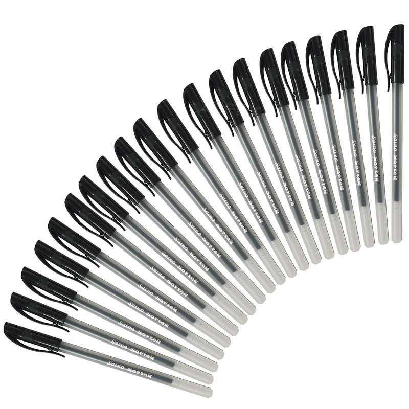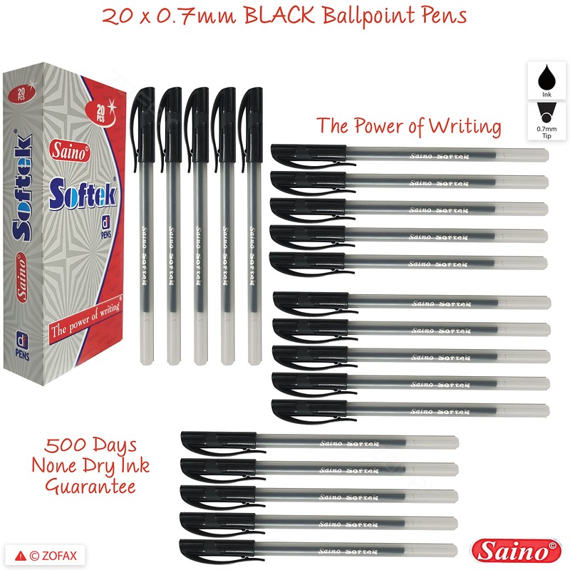 SAINO 20 x 0.7mm Fine Tip Softek BLACK Ballpoint Pens Smooth Writing Non Dry Guarantee