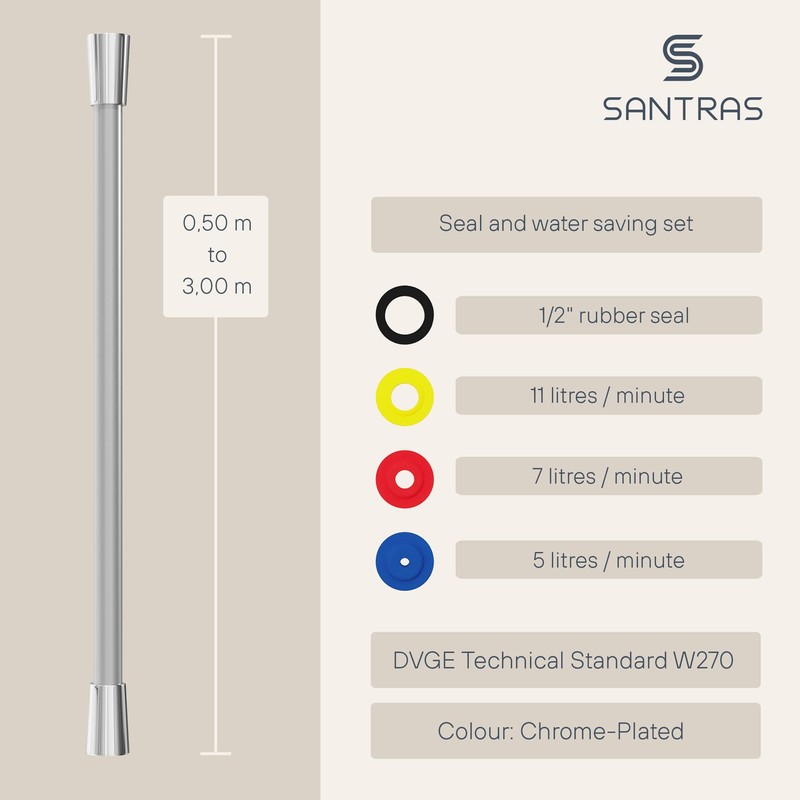 SANTRAS® Shower Hose Premium Chrome 1.50 m Made in Germany with Water Saver - Especially Flexible and Twist-Proof with Flow Limiter - Shower Hose in Stainless Steel Look Made of Easy Clean Material
