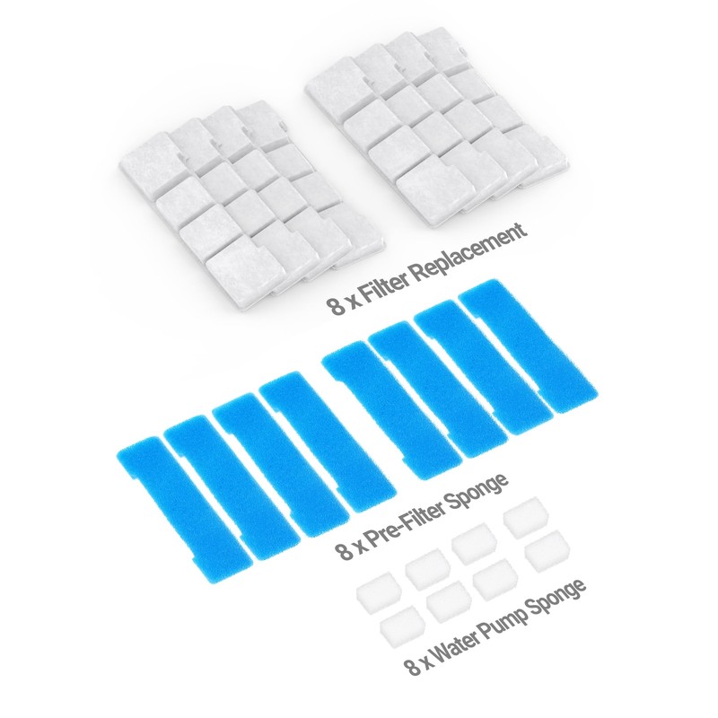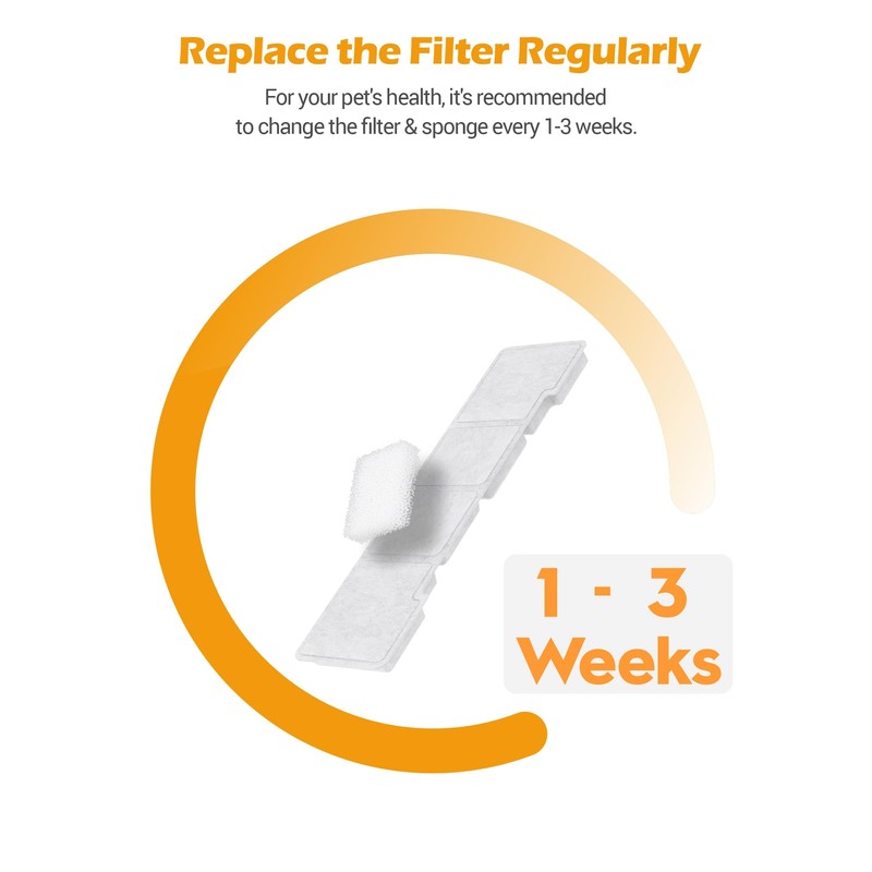 - Rinse Before Use: Please soak and rinse the filter, pre-filter sponge, and pump sponge before use. For your pet's health, it's recommended to replace the filter and sponges every 1-3 weeks. If you have multiple pets, it is recommended to change the filter more often.