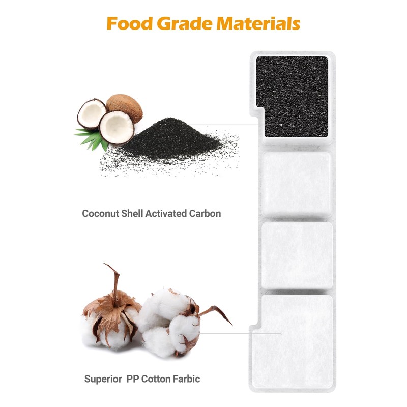 - Food Grade Materials: SIBAYS water fountain filters are made of all food grade material. The superior PP cotton layer is durable and longer-lasting. Natural coconut shell activated carbon tightly sealed inside won't penetrate through the pp cotton, no carbon particles in water.
