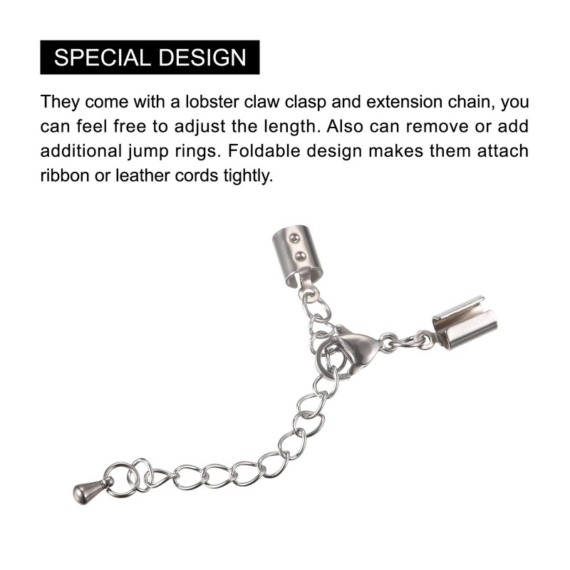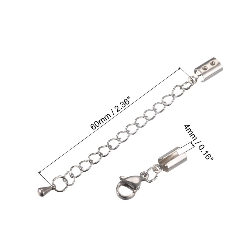 - WHAT YOU GET - You will get 5 sets of fold over crimp end tips with lobster claw clasps & extension chain to meet your various uses: Color: Silver Tone; Fold Over Cord End Width: 4mm/ 0.16"; Extension Chain Length: 60mm/ 2.36". Please allow the small errors ±5mm of the chain length.