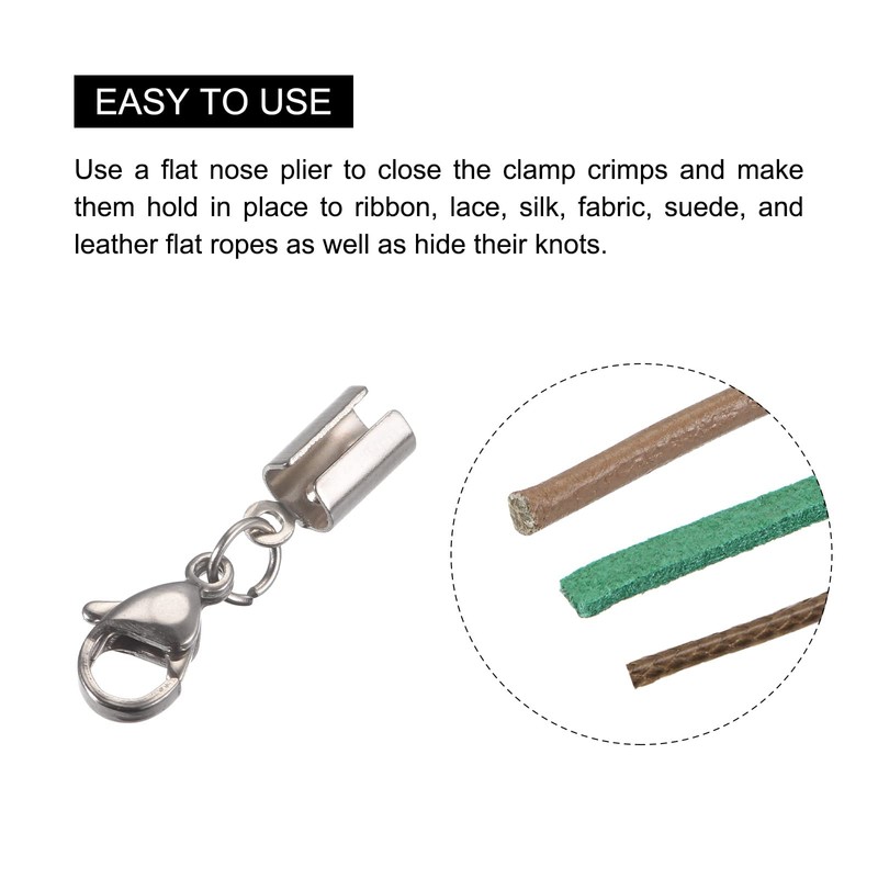 - EASY TO USE - Use a flat nose plier to close the clamp crimps and make them hold in place to ribbon, lace, silk, fabric, suede, and leather flat ropes as well as hide their knots