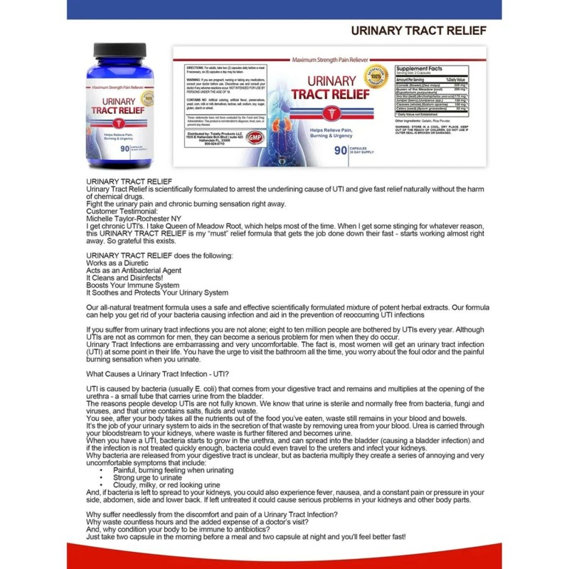 Urinary Tract Relief is a scientifically formulated to arrest the underlining cause of UTI and give fast relief naturally without the harm of chemical drugs. Fight the urinary pain and chronic burning sensation right away. URINARY TRACT RELIEF does the following: Works as a Diuretic Acts as an Antibacterial Agent It Cleans and Disinfects! Boosts Your Immune System It Soothes and Protects Your Urinary System Our all-natural treatment formula uses a safe and effective scientifically formulated mixture of potent herbal extracts. Our formula can help you get rid of your bacteria causing infection and aid in the prevention of reoccurring UTI infections. If you suffer from urinary tract infections you are not alone; eight to ten million people are bothered by UTIs every year. Although UTIs are not as common for men, they can become a serious problem for men when they do occur. Urinary Tract Infections are embarrassing and very uncomfortable. The fact is, most women will get an urinary tract infection (UTI) at some point in their life. You have the urge to visit the bathroom all the time, you worry about the foul odor and the painful burning sensation when you urinate.