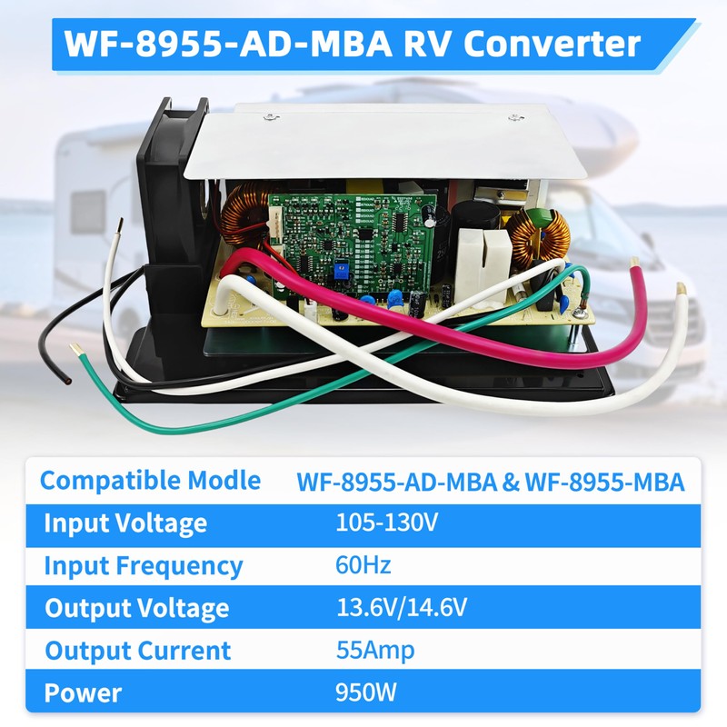 - 【Easy to Install】The WF-8955-AD-MBA 55 Amp RV Converter is a dependable replacement for your existing RV power converter. It installs in just 10 minutes using two screws, three AC wires, and two DC wires—no rewiring or extra connections needed. Compliant with RVIA and NEC safety standards, it's the ideal upgrade for stable and efficient 12V DC power in your RV.