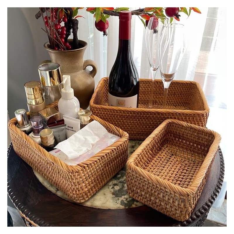 YANGQIHOME Wicker Storage Basket, Rectangular Rattan Fruit Baskets, Natural Woven Serving Basket and Organizer for Shelf (Set of 3)