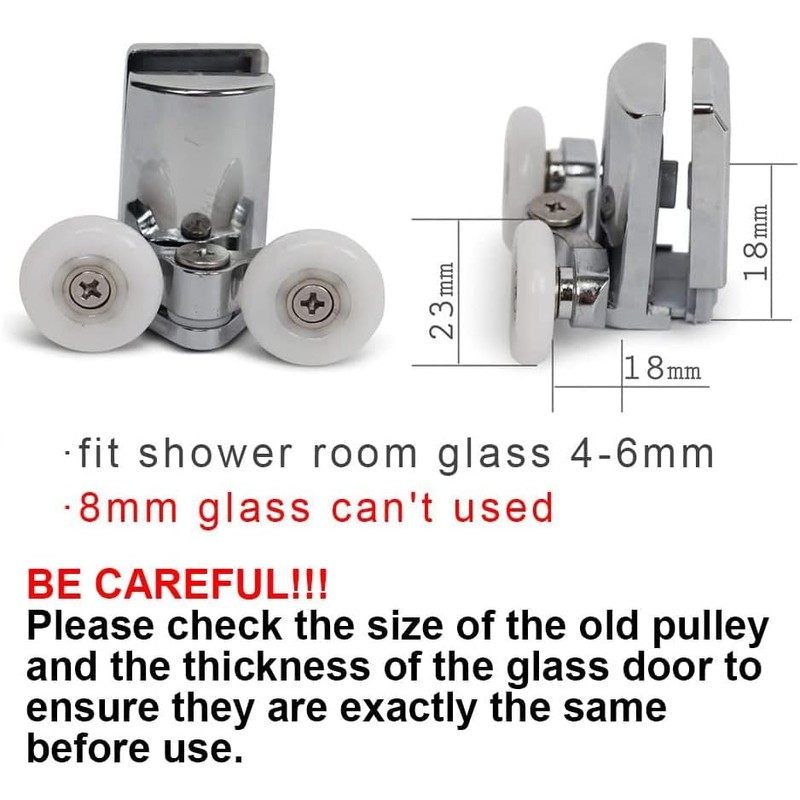 - Lower Wheel (23mm) 2pcs. Install 4-6mm thickness shower glass door. 8mm thickness shower glass door cannot be used