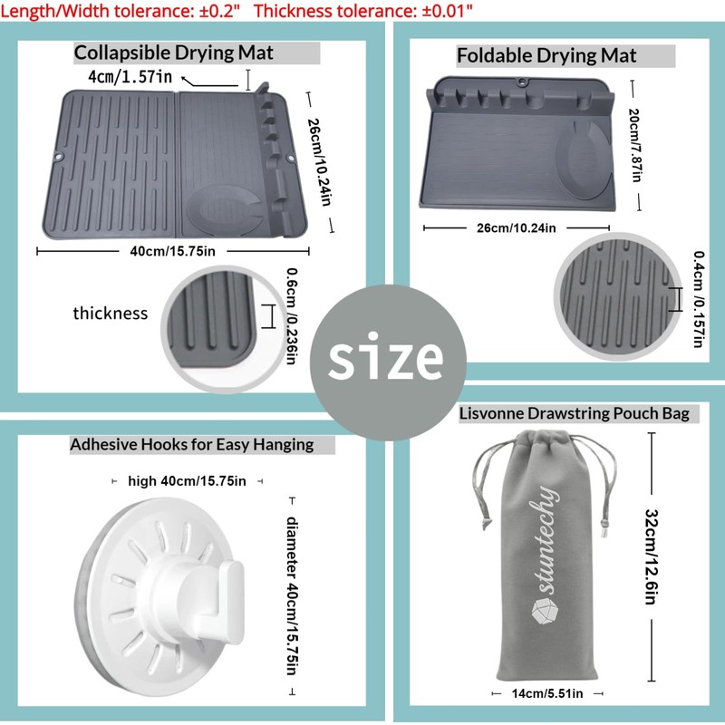 0.24'' Thick Silicone Kitchen Bundle - 15.75"x10.24" Foldable Drying Mat with Drawstring Bag & Hook | Non-Slip Heat-Resistant Surface Guard for Countertops, RV, BBQ Tasks