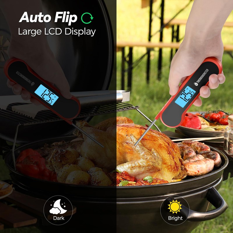 - 【Auto Flip Large LCD Display】: Features an innovative auto flip large LCD screen with exceptional brightness, this food thermometer is perfect for both left and right hand users outdoors and at night.