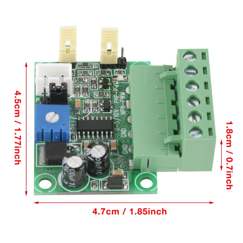 1、This module can convert 0-5V or 0-10V analog input voltage into 0-100% PWM signal. 2、PWM signal frequency range is 2KHZ-20KHZ, maximum is 20KHZ, default minimum is 2KHZ. 3、Default function is converting 0-10V into 0-100% 2KHZ PWM signal; output frequency can be set by adjusting potentiometer as needed. 4、PWM signal and voltage can be direct ratio(positive phase output) or inverse ratio (negative phase output). 5、There are two kinds of PWM signal, PNP-PWM output and NPN-PWM output;the PNP-PWM output is only 5V level, NPN-PWM output is 5V and 24V level.