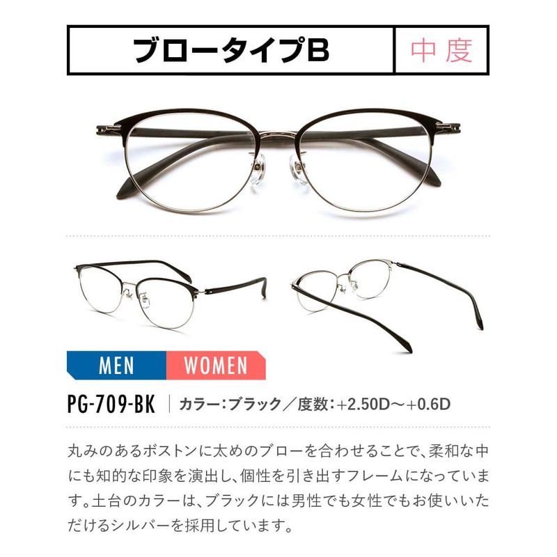 ピントグラス 視力補正用メガネ ブラック 中度 +0.6~+2.5D PG-709-BK