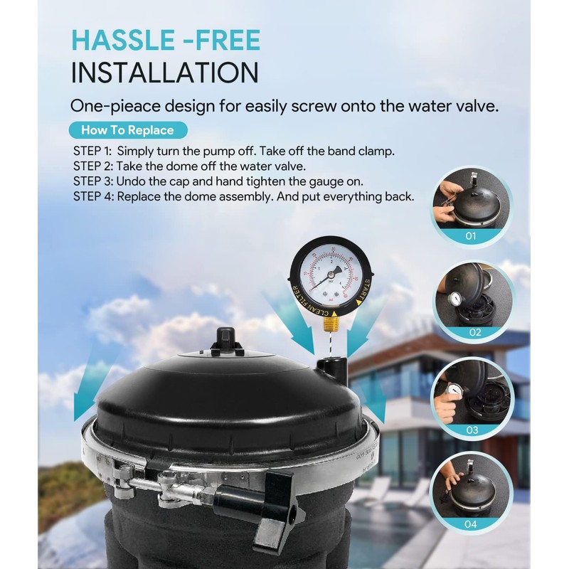 - 【Easy to Install & Use】 One-piece replacement design allows for easy installation. Simply turn the pump off. Take the knob off. Take off the band clamp and the dome off the water valve. Undo the cap and hand tighten the gauge on. Replace the dome assembly. And put everything back. No electricity required. It will work automatically when the pump is running.