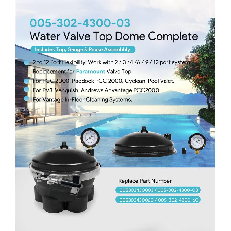 - 【Great Compatibility】 005-302-4300-03 Water Valve Top Dome Complete Assembly Comes with brand new Valve Dome x1, Pressure Gauge (005-302-3590-00) x1, Pause Assembly (005-302-3502-00) x1. Replaces Paramount Valve Top for PCC 2000, Paddock PCC 2000, Cyclean, Pool Valet, PV3, Vanquish, Andrews Advantage PCC2000 and Vantage In-Floor Cleaning Systems. All Part Numbers used for this part: 005302430003 / 005-302-4300-03 / 005302430060 / 005-302-4300-60.