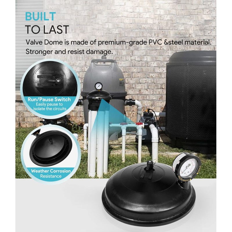 - 【Perfect Design】 2 to 12 port flexibility, convenient pause mode, and water-powered, non-electric design. Work with 2 / 3 / 6 / 9 / 12 port system. The run/pause switch at the top of the valve allows you to conveniently pause the system to isolate the circuits inside and outside the pool. The PSI gauge is designed with a clearly marked sliding pressure gauge to indicate the operation of the system and when the pressure has increased to the point where the filter needs to be cleaned.