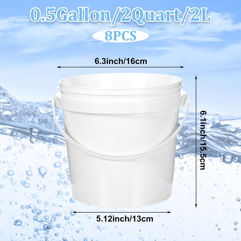 1/2 Gallon Small Plastic Buckets with Lids & Handles, 8 Pack 2 Quart Leak-Proof Food Containers All Purpose Empty Paint Cans for Water Storage, Crafts, Garage Organization, Durable Stackable - White