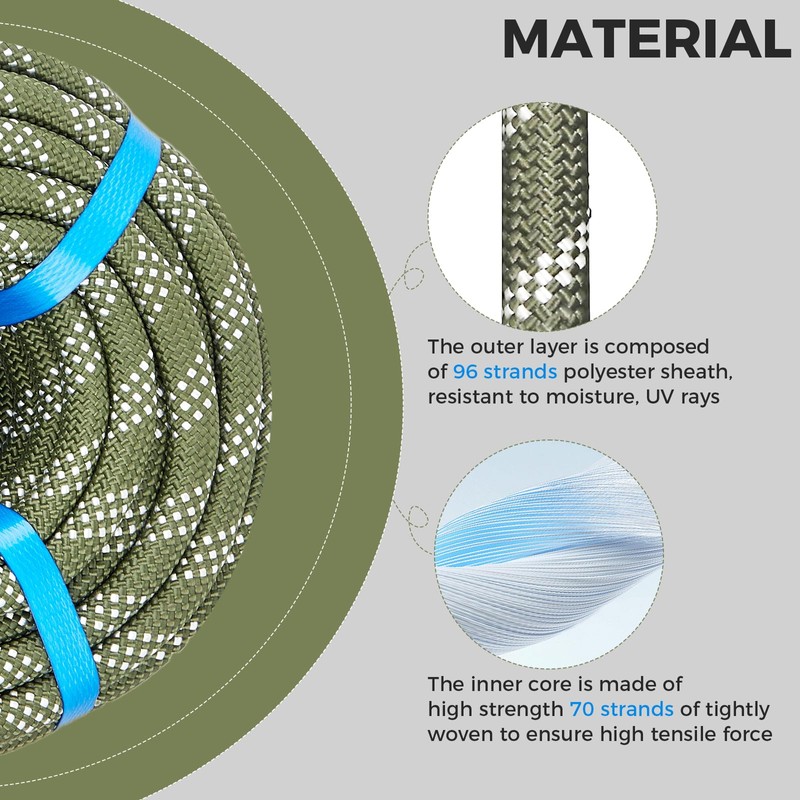 - High Strength: This arborist rigging Rope is composed of 96 strands polyester sheath and high strength 70 strands of tightly woven nylon inner core, resistant to moisture, UV rays, chemicals, and aging, this nylon rope maintains its integrity over time.