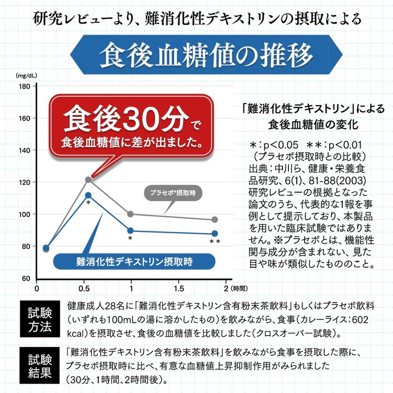 • <届出番号>H964 <届出表示> 本品には、難消化性デキストリン(食物繊維)が含まれます。難消化性デキストリンには、 糖の吸収を抑えることにより、食後血糖値の上昇を抑制する機能があることが報告されてい ます。 また、継続して摂取することでBMIが高めの方の内臓脂肪を減らす機能があることが 報告されています。 本品は国の許可を受けたものではありません。 食生活は、主食、主菜、副菜を基本に、食事のバランスを。 本品は、疾病の診断、治療、予防を目的としたものではありません。 本品は、疾病に罹患している者、未成年者、妊産婦(妊娠を計画している 者を含む。)及び授乳婦を対象に開発された食品ではありません。 疾病に罹患している場合は医師に、医薬品を服用している場合は医師、薬剤師に相談してく ださい。 体調に異変を感じた際は、速やかに摂取を中止し、医師に相談してください。