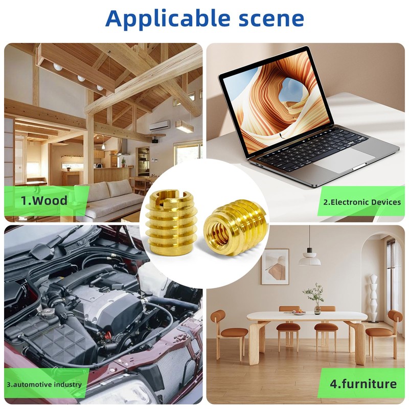 - đ”Threaded Inserts for Wood - These wood threaded insert are made of reliable brass material, knife-thread solid brass threaded designed, Thread inserts provide a stronger and more secure connection compared to just screwing directly into wood. They can support heavier loads and stresses without the risk of the screw stripping the wood.