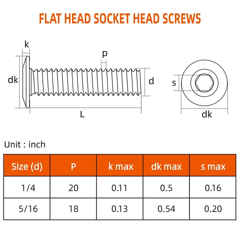 - Drive Type: Hex Socket; Head Style: Flat Head; Screws Size: 1/4-20 x 3-1/2 Inch.