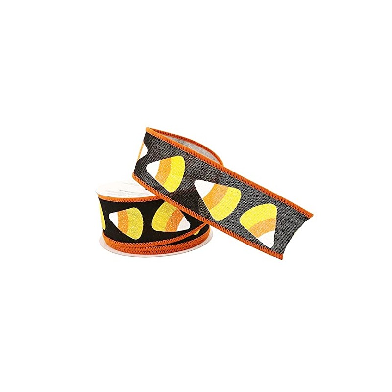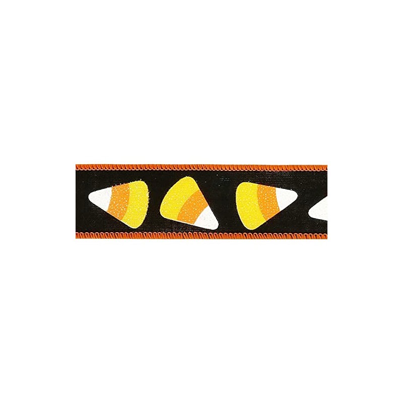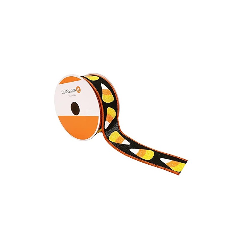 Give your crafts a charming touch of Halloween fun with this ribbon from Celebrate It. Use along with spooky figurines, lights and tinsel to create festive garlands and wreaths, embellish floral arrangements and more! Details: Candy corn pattern with orange edges on black 1.5" x 25ft. (3.8cm x 7.6m) Woven Wired sewn edge Polyester and cotton