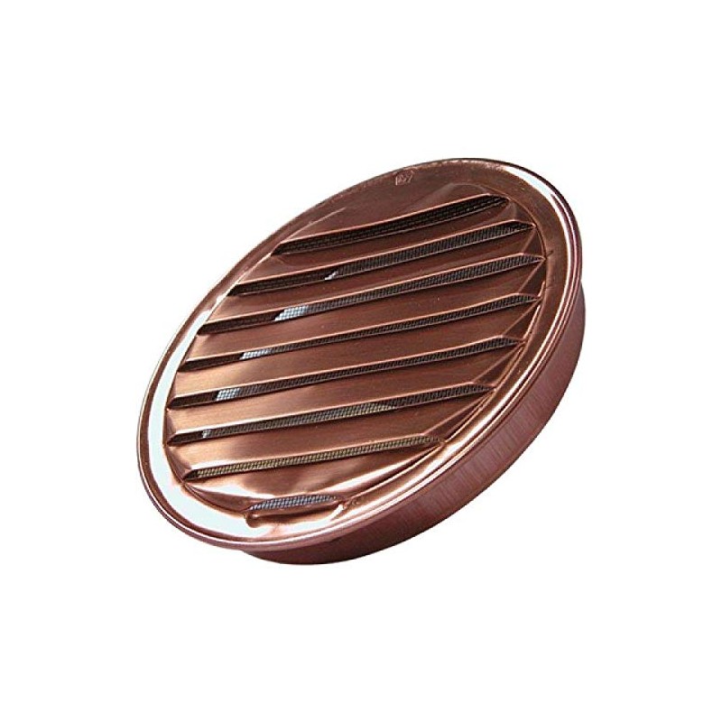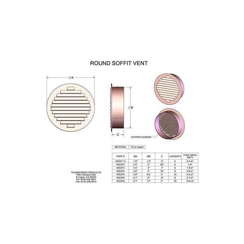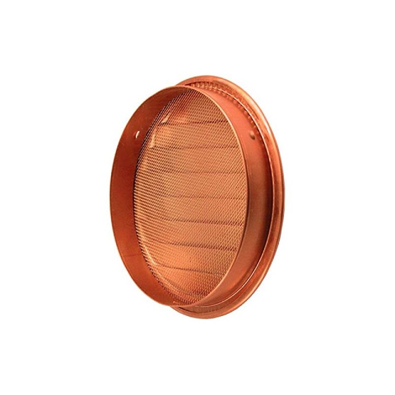 Round copper soffit vent with screen. Available in 1", 1.5", 2", 3", 4", and 6" sizes. Applications include soffit venting, wall venting, and more. Manufactured in the USA.