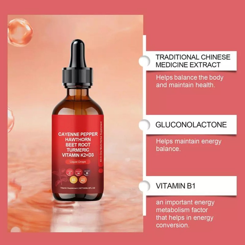 🌟 Cayenne Pepper Hawthorn Beet Root Turmeric Vitamin K2+D3 Liquid Drops