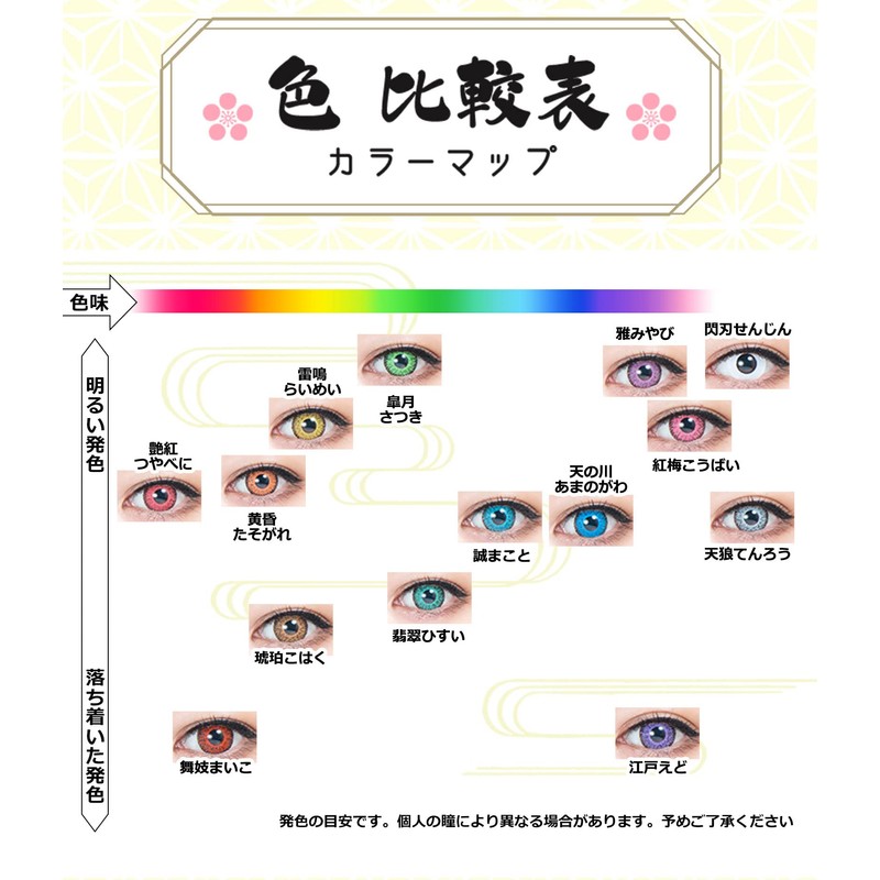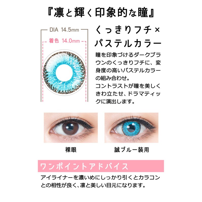 - 【誠 -まこと- (ブルー)】➡新撰組の羽織を連想させる浅葱色をイメージしたレンズ。ターコイズブルーが美しい水色の目元を演出します。暗い場所でも発色が良く、男性キャラにはキリッとした印象、女性キャラには落ち着いた印象と、幅広く使えます