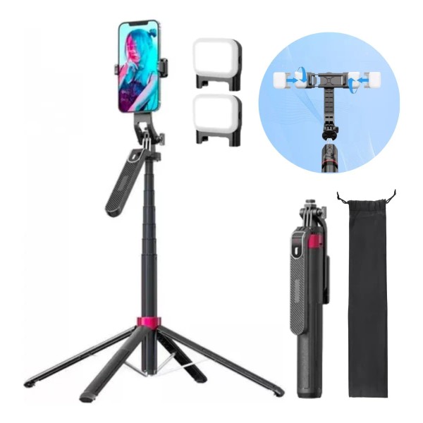 Trípode multifuncional 2 en 1 diseñado para capturar fotos y videos con total comodidad y estabilidad. Se extiende hasta 1.8 metros, convirtiéndose en selfie stick o soporte fijo para celular. Incluye control remoto Bluetooth y es compatible con una amplia gama de dispositivos.