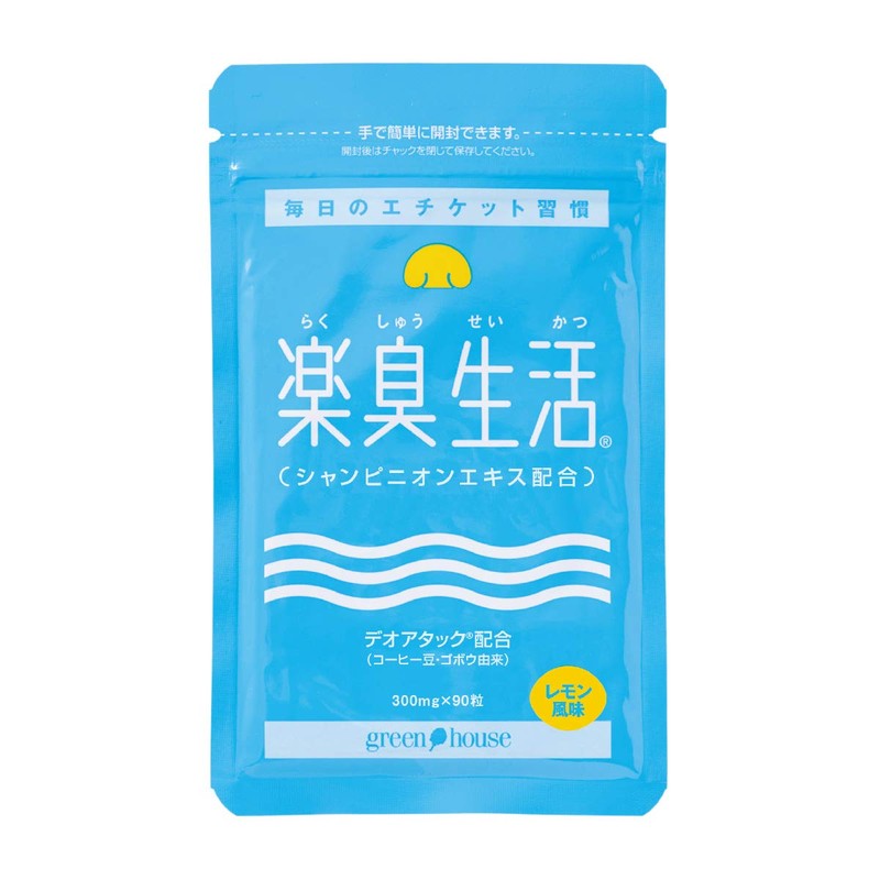 - エチケット対策にオススメのサプリメントです。「楽臭生活」は150倍濃縮のシャンピニオンエキスを、1回3粒あたり225mgと高配合し、天然由来の成分デオアタックを30mgも配合。さらに、2019年秋のリニューアルに当たり、レモンの香りをプラス。