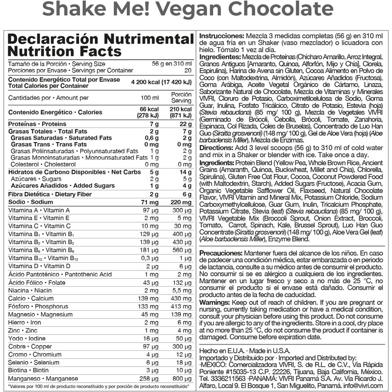 Vegan Shake Me! – Alimento en Polvo Vegano Sabor Chocolate Fusión | 20 Porciones | 45 Nutrientes Esenciales | 23 Vitaminas y Minerales | 22 g de Proteína