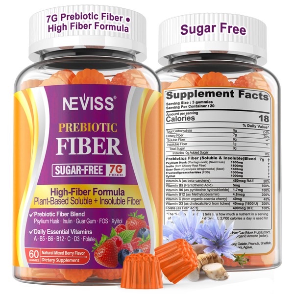1Pack Prebiotic Fiber Gummies for Adults 7G with Psyllium Husk Fiber , Soluble Fiber + Insoluble Fiber, Inulin, Fos, Multivitamin, Fiber Supplement for Daily Digestive Health,Regularity Gut,Sugar Free