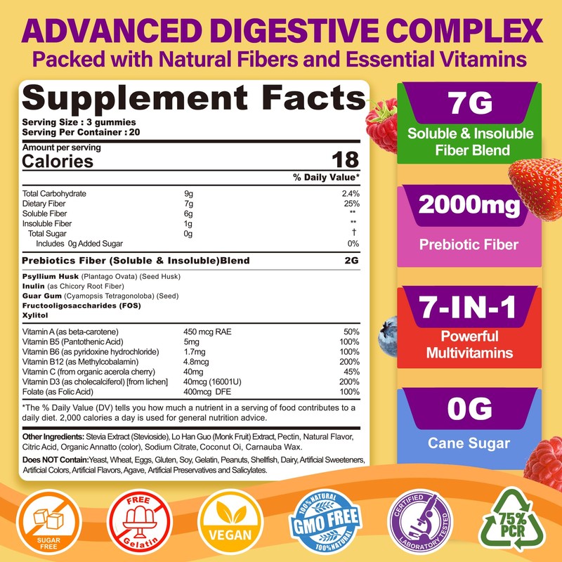 Unleash the power of fiber for women & men with our unique formula to support digestive health and relieve bloating. 7G Extra Strength soluble & insoluble fiber increases satiety and promotes regular bowel movements to aid digestion. Includes 2000mg prebiotic fiber blend and multivitamins (A, C, D3, B6, B12, Folic) to support optimal gut health, prevent constipation, and fight fatigue. Don’t miss the benefits of our fiber gummies!