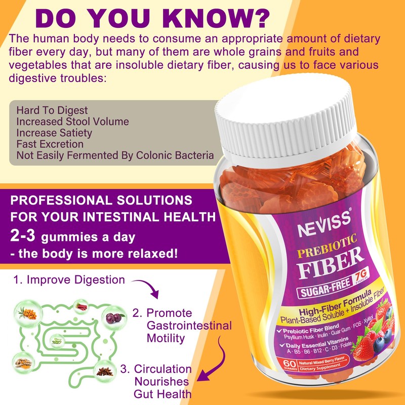 Soluble fiber, psyllium husk, inulin, guar gum, and FOS promote the growth of beneficial gut bacteria, improving bowel regularity, relieving constipation, and enhancing nutrient absorption. Xylitol helps lower cholesterol levels, slow carbohydrate absorption, and improve sugar levels. Ideal for those suffering from constipation, gas, bloating, and food accumulation to create a harmonious gut environment.
